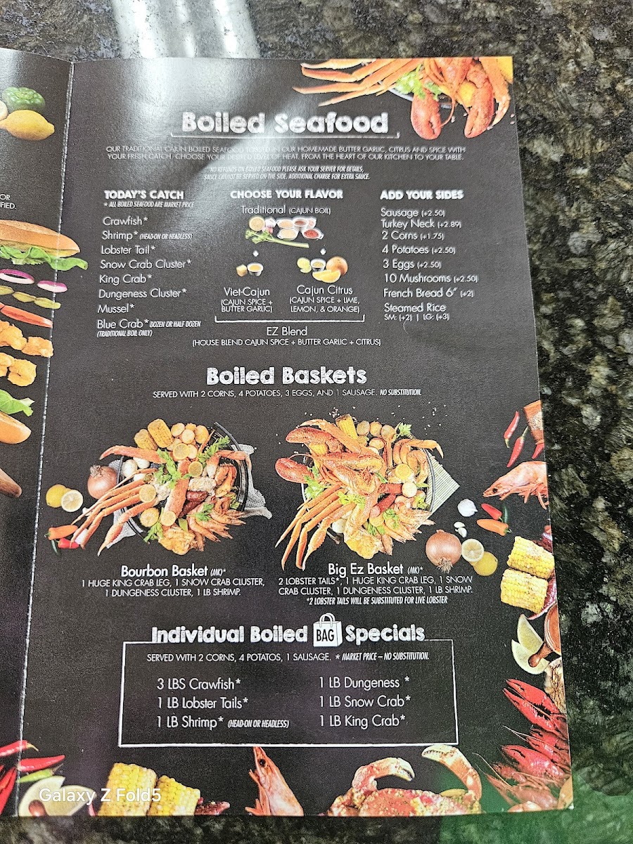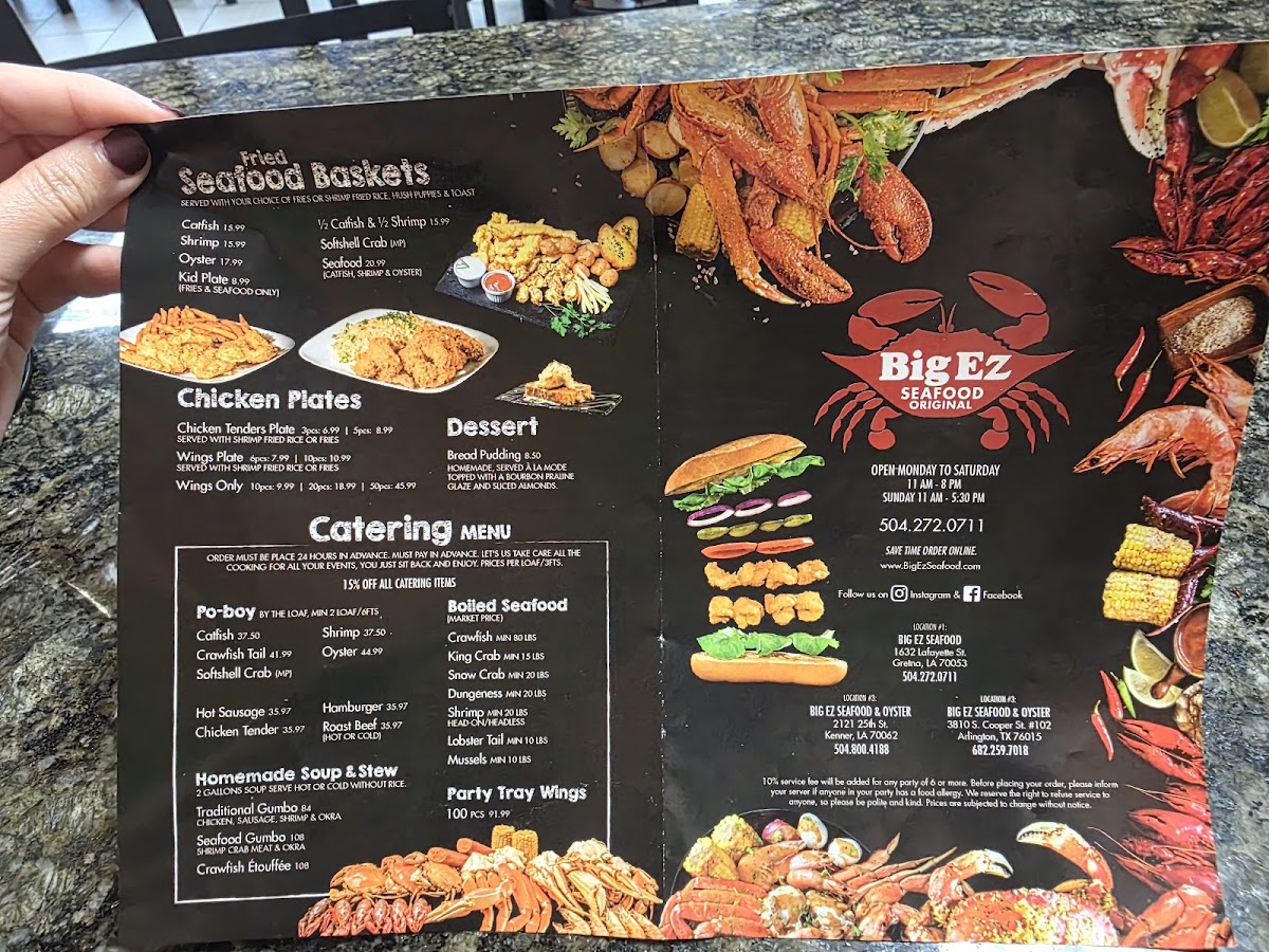 If you're in the mood for a seafood feast with a local twist, look no further than the Big Ez Seafood Menu. Nestled in the heart of Gretna, LA, this cozy spot offers a diverse selection of freshly prepared seafood dishes, each bursting with flavor. From succulent shrimp and fish to savory oysters and crabs, every bite promises a satisfying experience. The menu boasts a variety of options to suit all tastes, whether you’re craving a classic po'boy or a hearty seafood boil. Their expert chefs use only the finest ingredients, ensuring that each dish is crafted to perfection. Whether you're stopping by for a casual meal with friends or a special occasion, Big Ez Seafood never disappoints with its mouthwatering offerings.